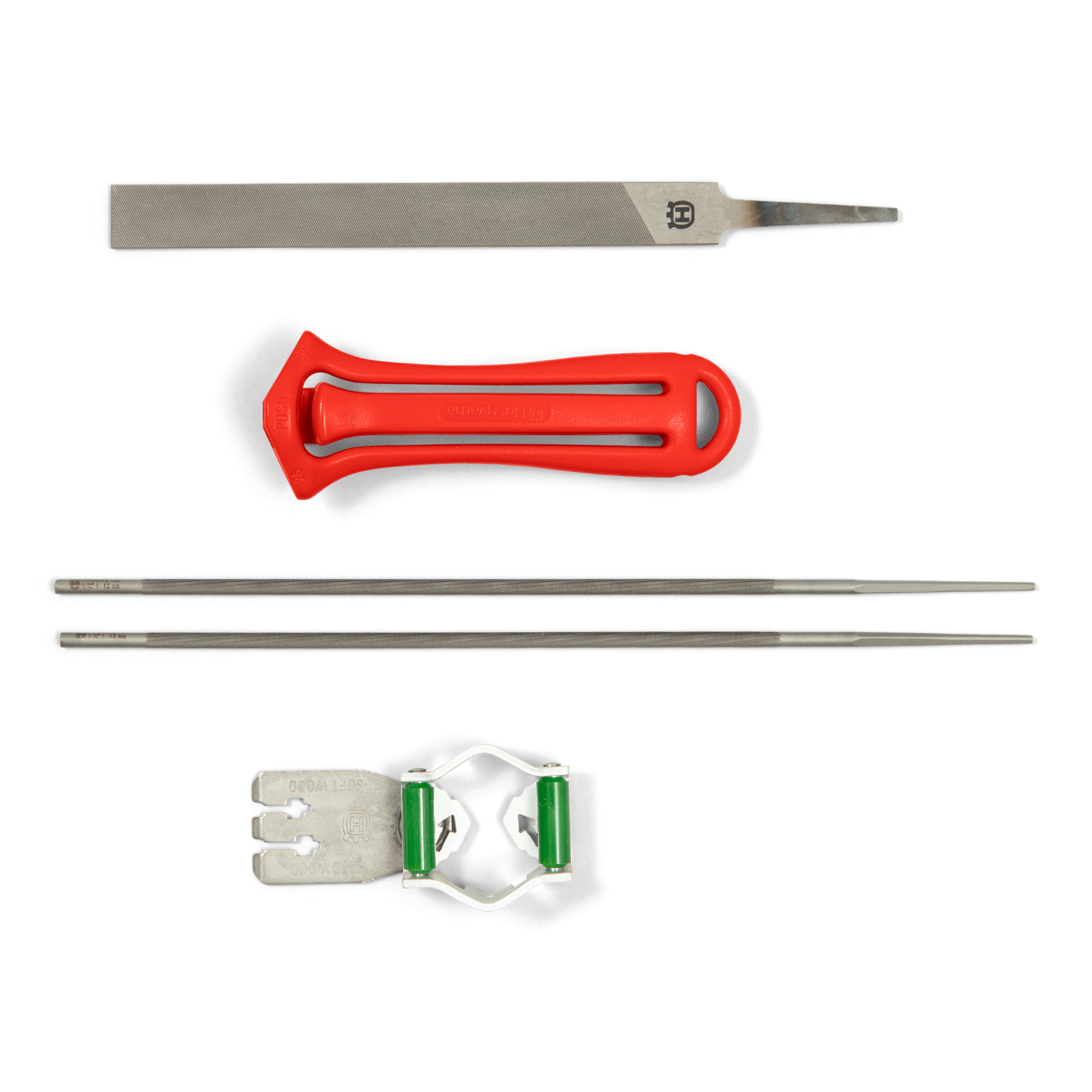 Komplett filkit för att förenkla arbetet med att hålla kedjan i trim. Med en korrekt filad kedja blir ditt arbete enklare och säkrare. Filkitet innehåller ett filhandtag, en kombimall eller en filmall och en underställningsmall, två rundfilar och en flatfil.