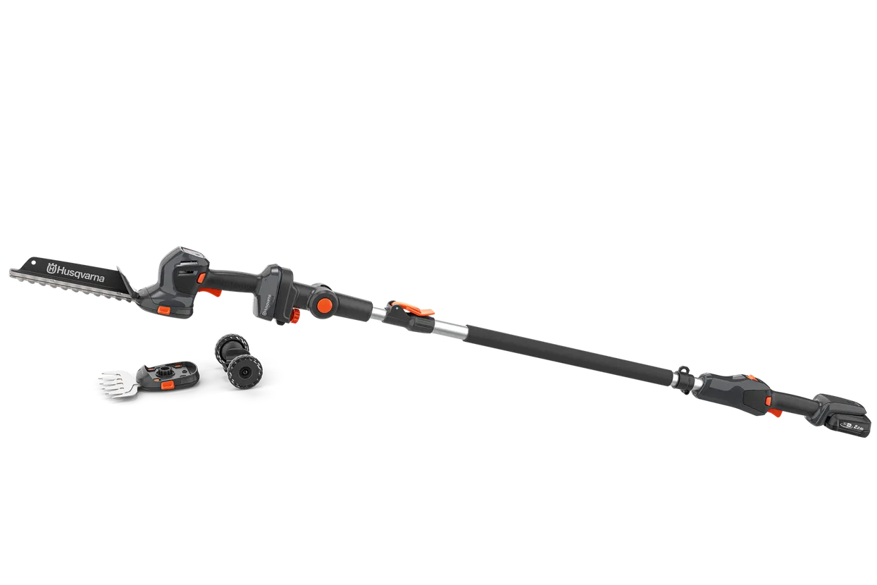 En kompletterande stång med ett teleskopiskt skaft är inkluderat för att öka räckvidden till upp till 3 meter och skapa en ergonomisk arbetsställning. I syfte att minimera det nödvändiga förvaringsutrymmet är busk-/grässaxen kompatibel med Aspire™-förvaringslösningen och levereras med en specialanpassad krok för praktisk upphängning på en vägg.
