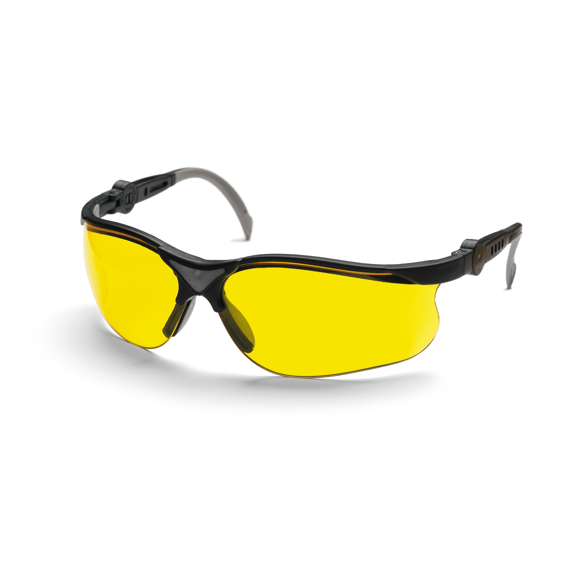 Skyddsglasögon med repfria, gula linser för bättre syn i mörka förhållanden. Med bågar som kan förlängas och linser som kan vinklas. Godkända enligt EN 166, ANSI Z87+.